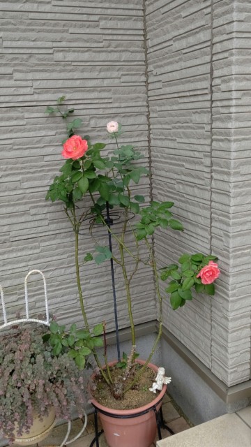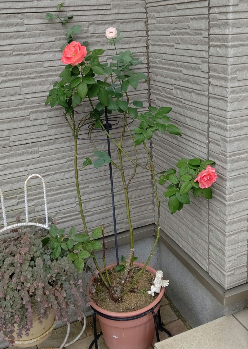 駐車スペースの庭の花壇にバラの花が咲き始めました。