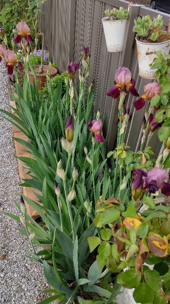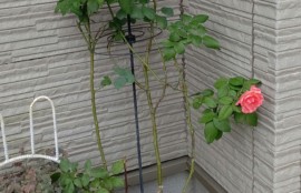 駐車スペースの庭の花壇にバラの花が咲き始めました。