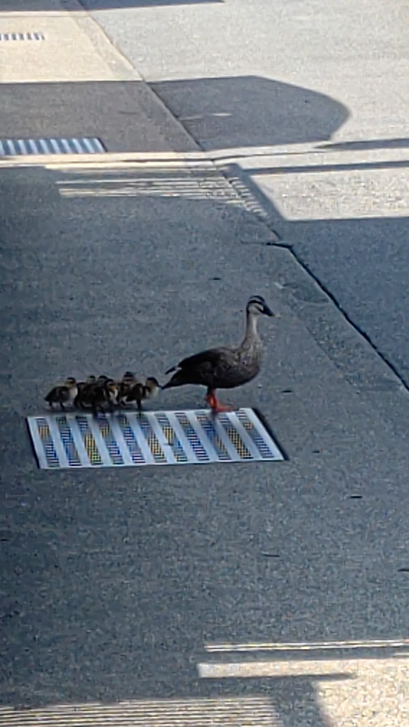 カルガモの親子が自宅の西側の市道に居て、親鴨が鳴きながらウロウロしていたので、